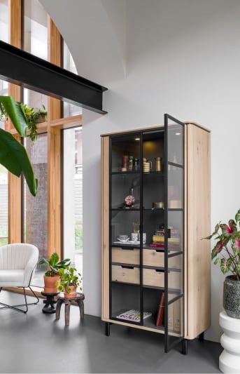 Livada is een strak en eigentijds programma. Het is gemaakt van wild eikenfineer dat is afgewerkt in 2 kleuren: Natural en Onyx. De meubels zijn verder afgewerkt met melamine en metaal, wat zorgt voor een moderne uitstraling. Eikenfineer heeft een toplaag van echt hout en vertoont de typische kenmerken van eiken, zoals natuurlijke kleurnuances, vlam- en nerftekeningen. De eiken delen van de collectie zijn beschermd met een extra laklaag. Blijf echter voorzichtig en zet een warme kom soep of kop koffie altijd op een onderzetter of placemat. Afhankelijk van de kleur van het eikenfineer, behandel je het meubel met CARE+ Mat Polish of CARE+ Foam cleaner. Met regelmatig onderhoud fris je het meubel op en heb je er nog langer plezier van. Let op: om aanspraak te kunnen maken op garantie, mogen meubels niet geschuurd worden!