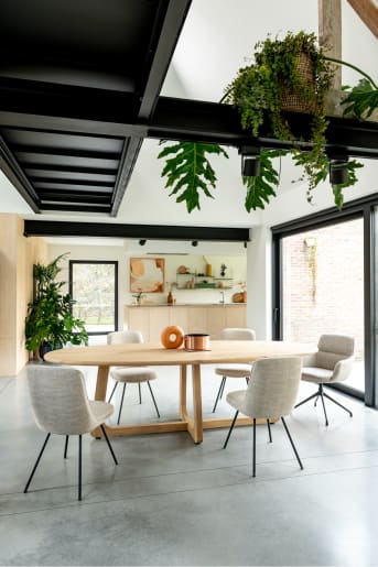 Ervaar de ideale combinatie van comfort en stijl met armstoel Mateo van Henders & Hazel. Deze elegante eetkamerstoel brengt moeiteloos een vleugje klasse in je interieur – of je nu houdt van strak en modern of eerder warm en klassiek. Het slanke ontwerp, de verfijnde stiksels en de zachte, luxueuze bekleding trekken meteen de aandacht en nodigen uit tot ontspannen tafelen. Dankzij de ergonomisch gevormde rug en zitting zit je zelfs tijdens lange avonden heerlijk comfortabel.Mateo is niet zomaar een stoel, maar een uitnodiging om te genieten van elk moment aan tafel. Je stelt hem volledig samen volgens jouw smaak: kies uit een rijk aanbod aan stoffen en kleuren, met of zonder armleuningen, en bepaal welk onderstel het best bij jouw woonstijl past – vier poten, wieltjes of een draaibare uitvoering. Deze uitvoering is voorzien van een draaipoot met wieltjes in graphiet en bekleed met de stof Bellini in een zachte kiezeltint – een subtiele blikvanger die charme en verfijning brengt in elke eetruimte.