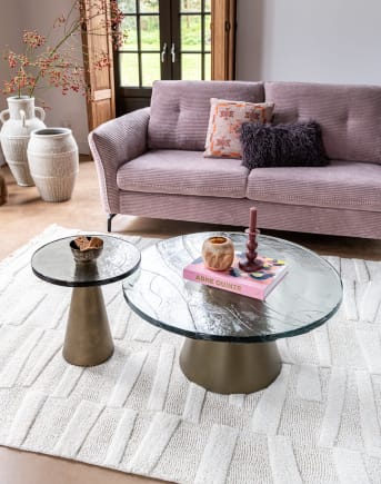 Salontafelserie Eloy heeft een centraal aluminium onderstel met een goudkleurige finish, maar wat deze tafelserie voornamelijk uniek maakt in onze collectie is het tafelblad. Dit tafelblad is volledig van glas gemaakt en heeft een duidelijke ingewerkte en voelbare reliëfstructuur. Het glas kun je best met een doek en water onderhouden.Het metaal is gemakkelijk schoon te maken. In de meeste gevallen is het voldoende om het oppervlak af te vegen met een droge doek om stof en vochtige plekken te kunnen verwijderen. Zijn er meer hardnekkige vlekken? Reinig het metaal vervolgens met een schone, licht vochtige doek en wrijf het oppervlak vervolgens droog met een doek. Zo voorkom je dat het metaal te lang te vochtig blijft, wat kan leiden tot roestvlekken.