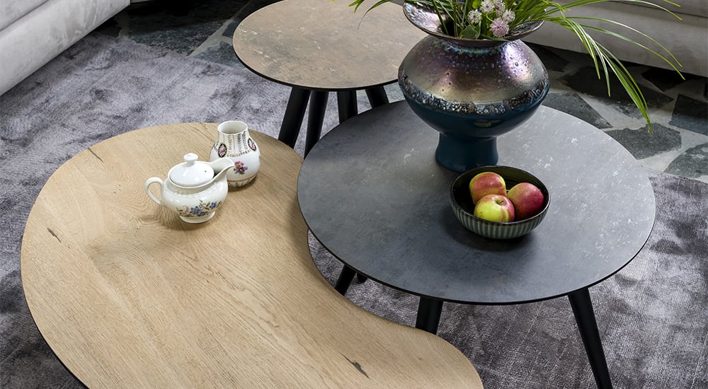Maze bestaat uit een speelse collectie salontafels in verschillende hoogtes en vormen. De tafels zijn in 4 uitvoeringen beschikbaar: antraciet, roest, burned oak en railway brown.De houttinten burned oak en railway brown zijn gemaakt van eikenfineer. Eikenfineer heeft een echte houten toplaag en ziet er dus uit als massief eiken, maar is minder gevoelig voor veranderingen in temperatuur en luchtvochtigheid. De bladen zijn behandeld met een lichte laklaag. Toch adviseren wij om het liefst altijd onderzetters te gebruiken om vlekken en kringen te voorkomen.De antraciet- en roestkleurige tafels zijn geproduceerd met een hoogwaardig Primo Laminato (HPL). Dat is een licht en tegelijkertijd erg sterk en slijtvast materiaal. De meubels zijn daardoor uitstekend bestand tegen o.a. zuren en krassen. Ook de kleurechtheid is hoog. Het materiaal heeft een gesloten oppervlak en is daardoor minder kwetsbaar dan echt hout, hoewel het daar sterk op lijkt. Dat maakt HPL ook erg onderhoudsvriendelijk. Afnemen met een vochtige doek is voor dagelijks onderhoud al voldoende.